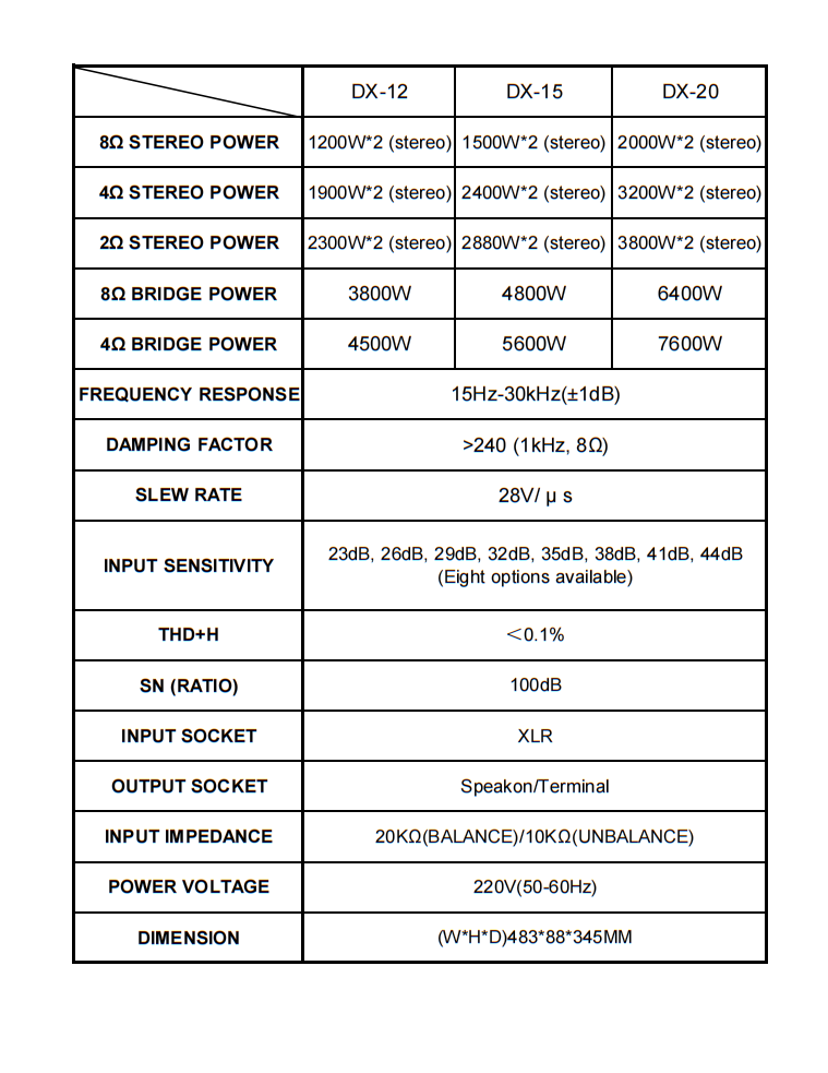 l It is equipped with the following protection functions: overload protection, overheating protection, short-circuit protection, distortion limiting, etc.
