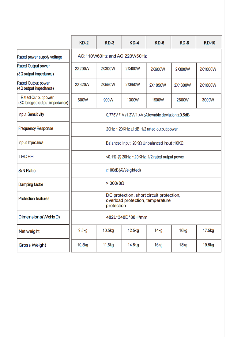 3. KD-3 Professional Power Amplifier, featuring high damping factor, net weight of 10.5kg and comprehensive protection functions.