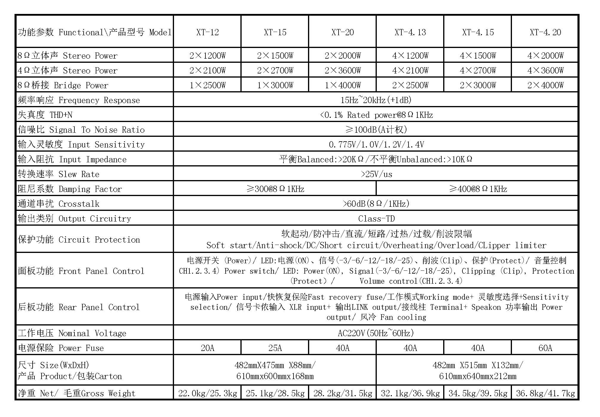1. XT-20: Power Amplifier: 2×2000W (8Ω), stable performance with multiple protections.