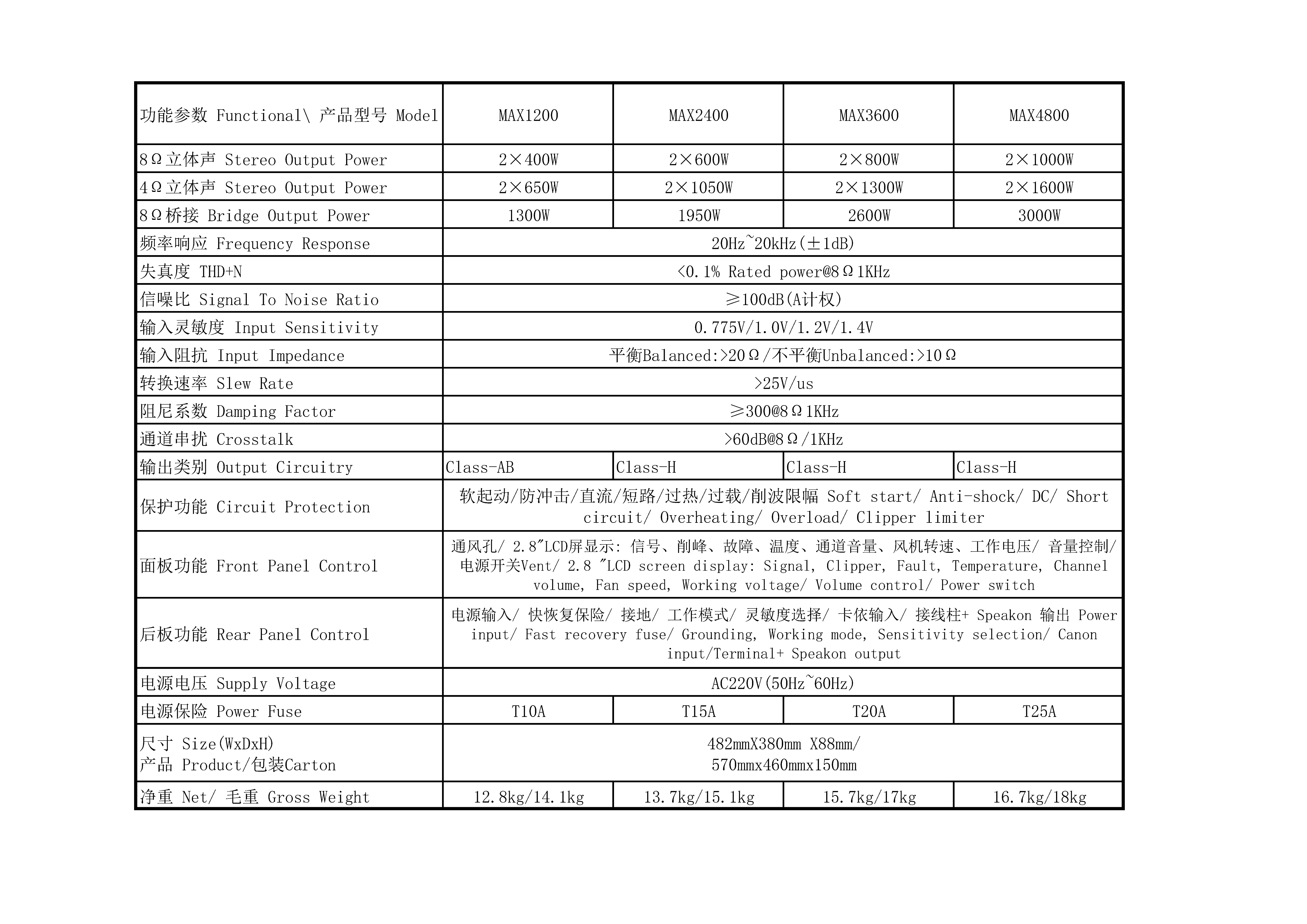 2. MAX1200 Professional Power Amplifier, Class-AB, dimensions 482×380×88mm, net weight 12.8kg.